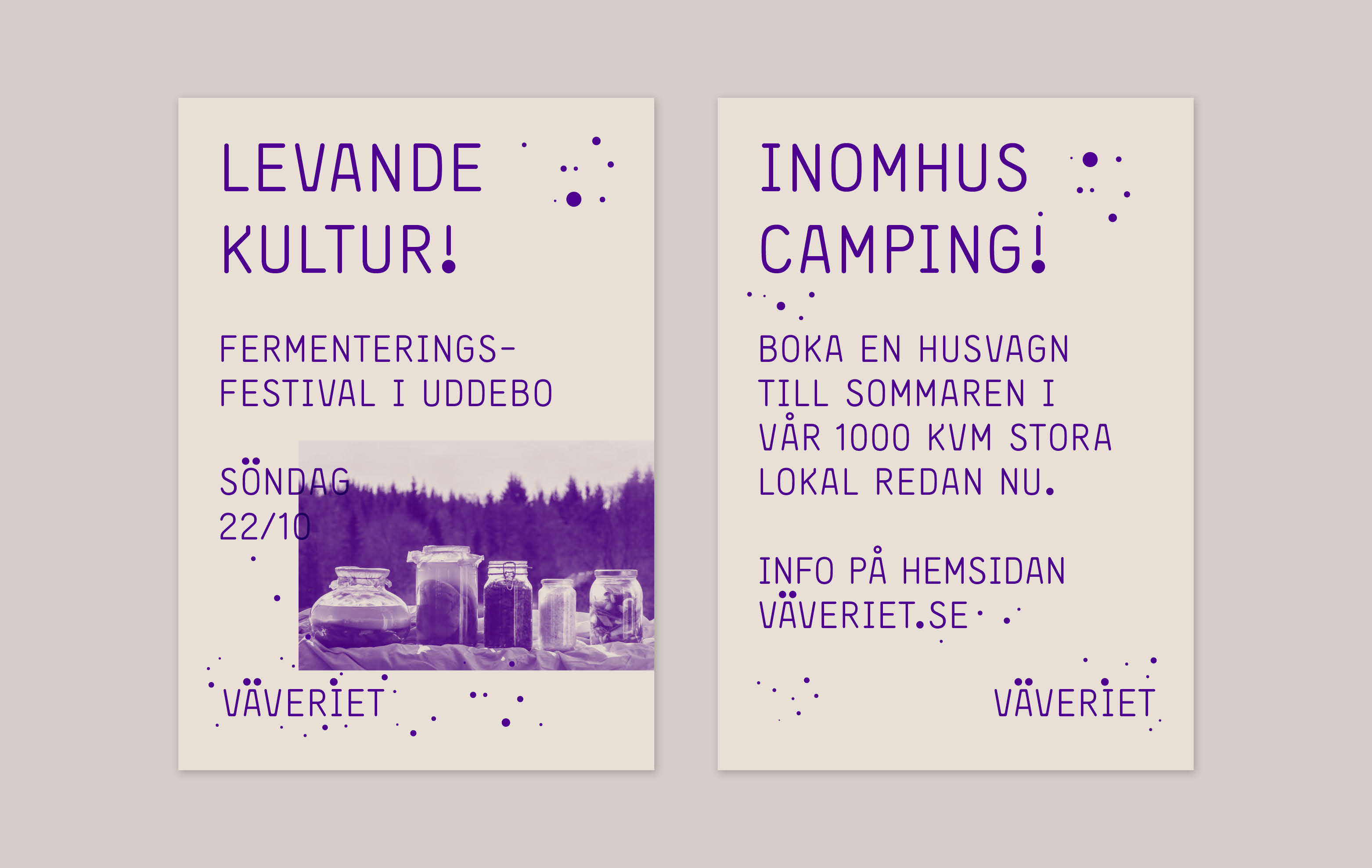 We created a colorful visual identity using circular dots as foundation. The dots are inspired by the color stains on the many floors as well as the stars of the open sky outside the factory, -emphasising the open and allowing atmosphere of the premises. Dots are also distinct visable in question and exclamation marks, which refers to the philosophical and political discussions at the factory.